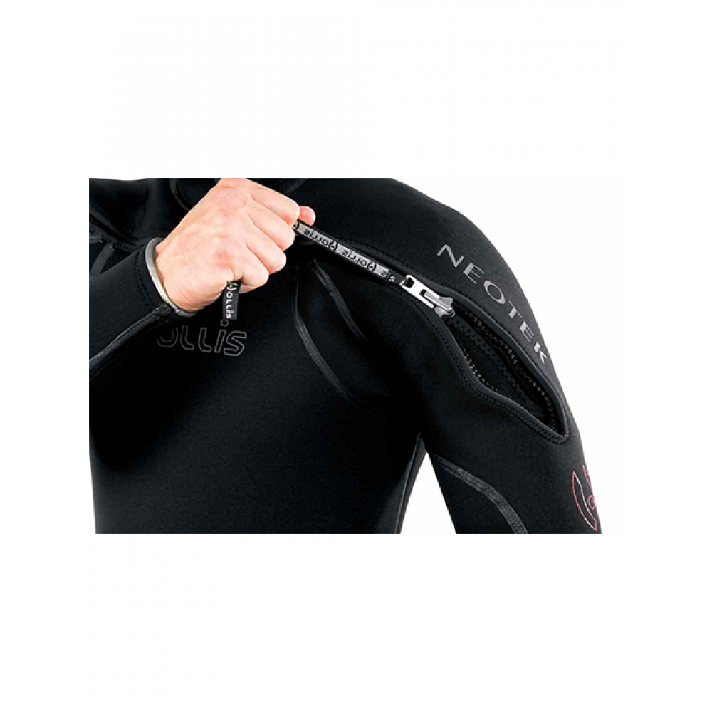 Enjoy the warmth of our Neotek 8/7/6 cold water hooded semi-dry. Constructed from a compression resistant 8/7/6 mm neoprene and a Hollis exclusive “ThermaSkin” inner liner. Includes a front neckdam with revolutionary G-Lock horizontal front zipper for easy on/off and a tight barrier against water intrusion. Arms and legs are also sealed against leaks with an internal dam. All seams are double glued and butt joined with a blind stitch construction which is all covered by a unique liquid seam. Fitted with generous pockets on both the left and right thigh and comes in 9 different sizes.